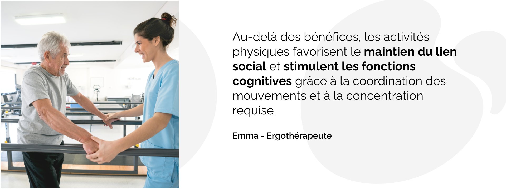 Exemple : Gym douce, marche accompagnée, danse assise, yoga sur chaise, jardinage.