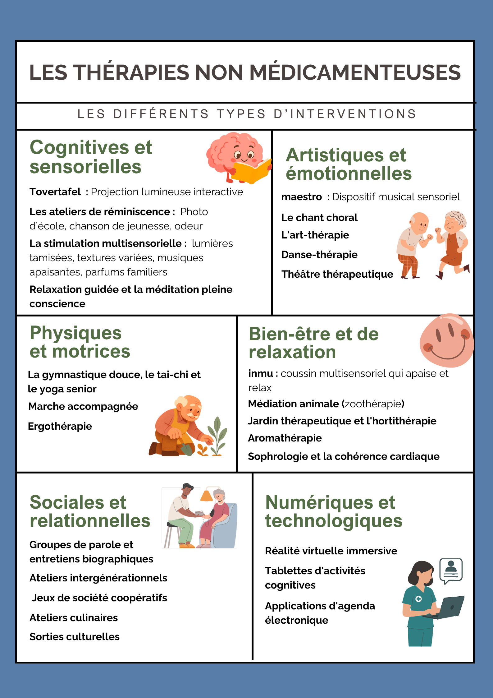 Les thérapies non médicamenteuses remplacent-elles les traitements médicamenteux ?Non, elles constituent une médecine complémentaire. Ces interventions agissent sur l'équilibre psychologique, émotionnel et social, là où les médicaments seuls ne suffisent pas toujours. Il ne s'agit pas de médecine alternative, mais d'une approche complémentaire validée scientifiquement.